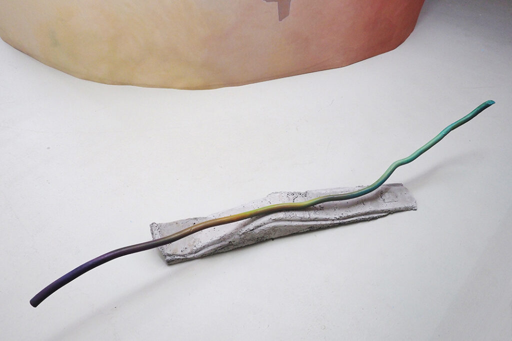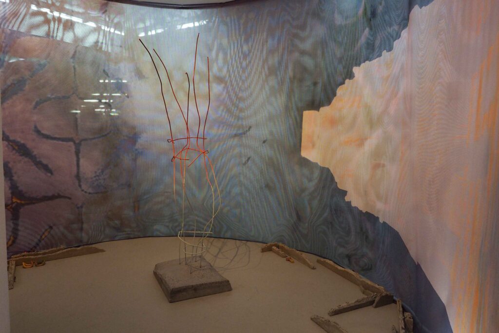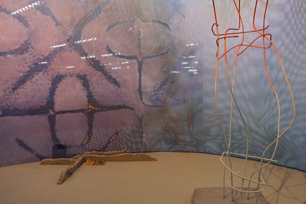 Sinamics oder Klanggeometrien sind Formen, die der Klang annimmt, wenn seine Schwingung mit Sand oder Wasser in Kontakt kommt. Diese Zeichnungen bilden den Boden der Installation.