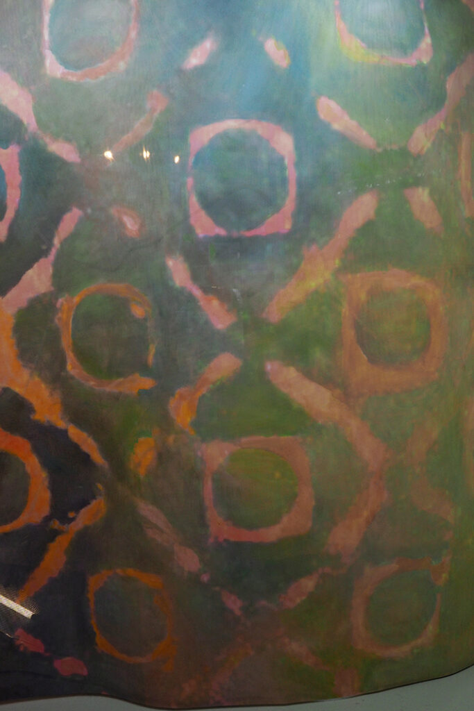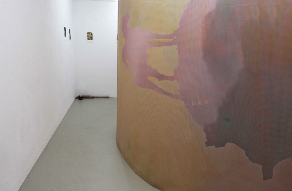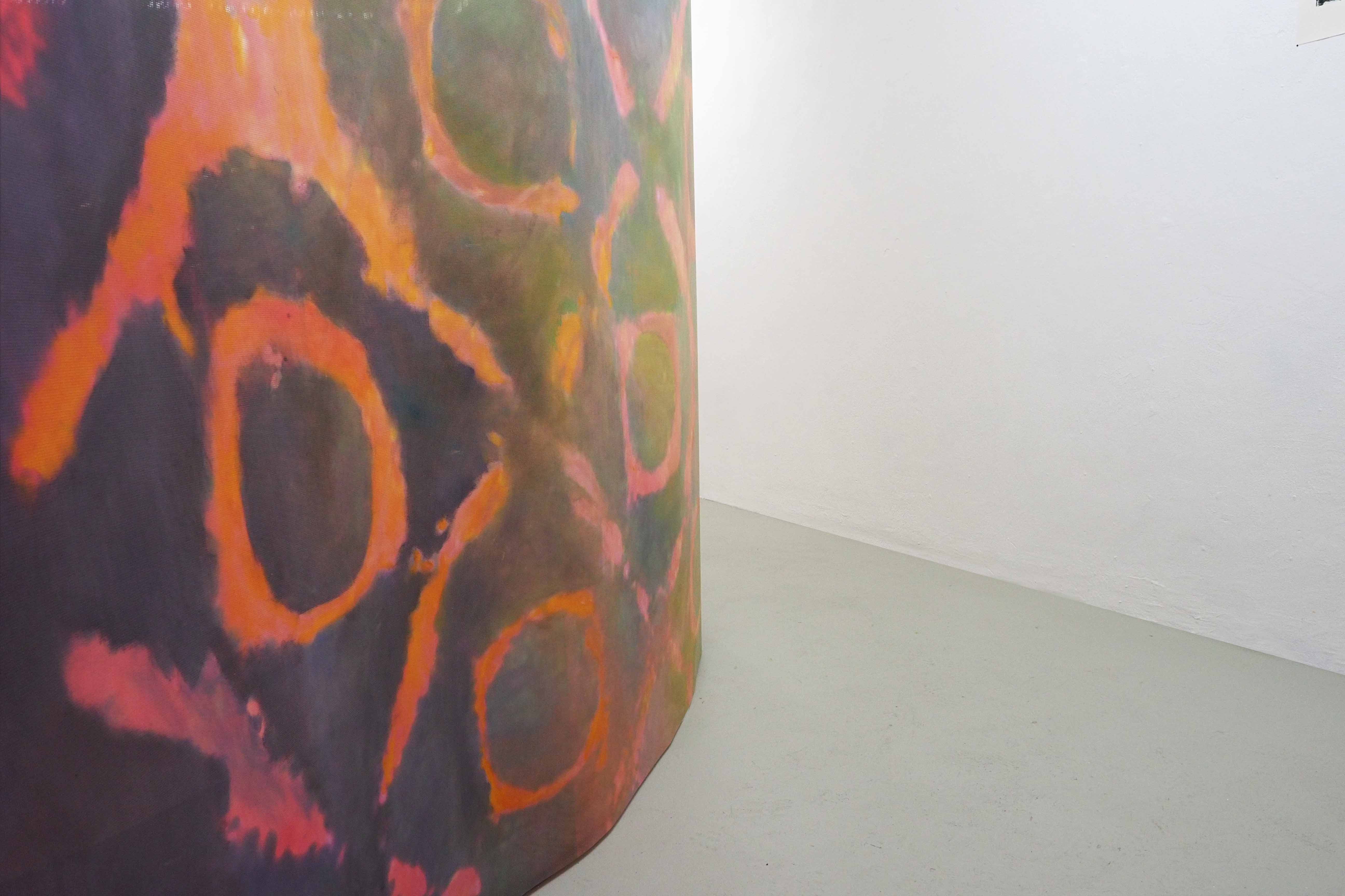 Der Klang wird in diesen geometrischen Formen visualisiert, die mit Ölfarbe auf große Leinwände gemalt sind, die den Raum umhüllen und so ein Innen und ein Außen schaffen.